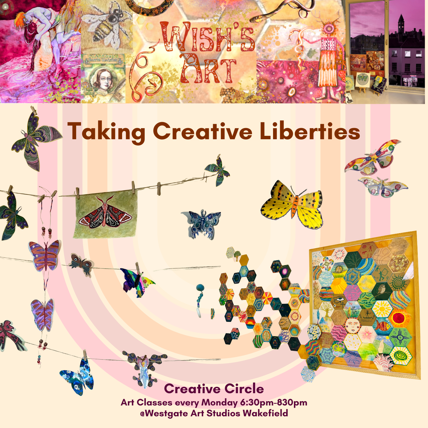 The mindfully manifested and playful creative pieces made by the artists attending the weekly Creative Circle art classes every Monday evening at Westgate Art Studios. Curated by the artists and art tutor, Shannon Wishon. There will be a creative activity as well if you fancy a brew and a sit down once you've reached the third floor!